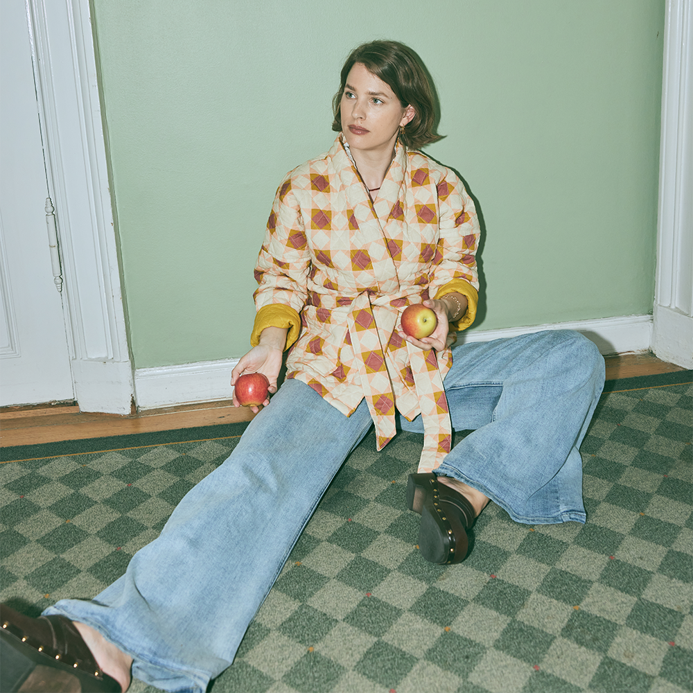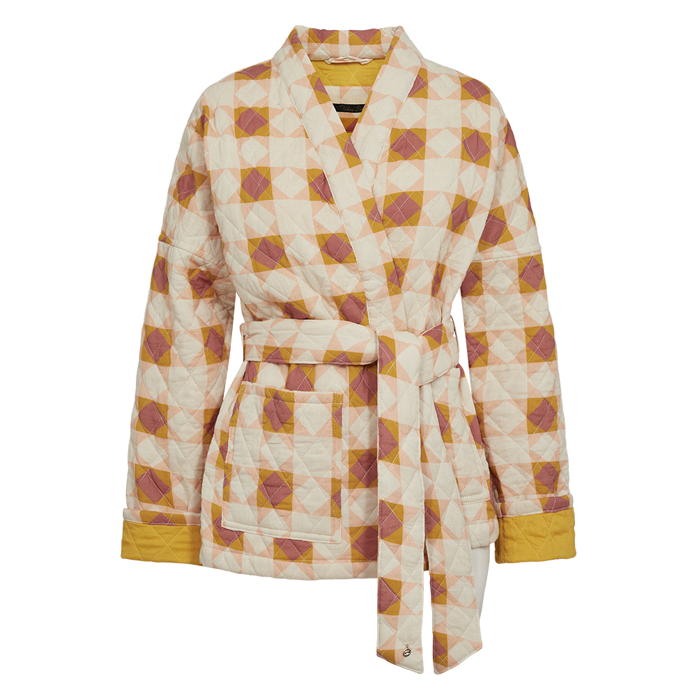 Jakken er foret med ensfarvet spicy mustard, bomuldsstof. Quilten er relativ tynd, så den let kan bruges som en lun cardigan eller let jakke.